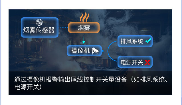 该方案可通过摄像机报警输出尾线控制开关量设备,如排风系统、电源开关等,当检测到烟雾时,可立即切断电源,避免产生次发性灾害,也可以打开排风系统,及时疏散室内有害气体的浓度;同时设备支持报警输入,当烟雾传感器异常断电时,可以及时通知监管人员,避免设备损坏,确保实时监测布防区域,保证环境安全。