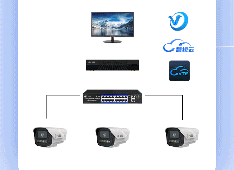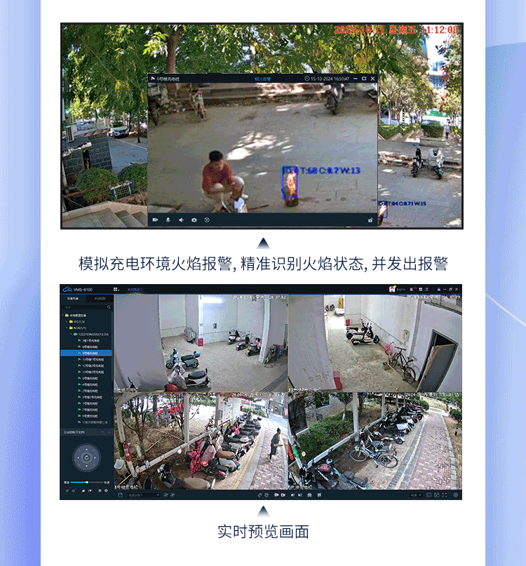 该方案中使用的摄像机内置高品质扬声器,能够清晰传达报警声音,有效吸引周围人员注意,及时采取火情控制措施;同时报警消息会第一时间上报至物业等相关监管人员的终端设备,用户可通过手机app、电脑vms-6100、慧视云帆等端口实时查看。同时支持tf卡和nvr录像机存储,监控画面溯源查询有保障。