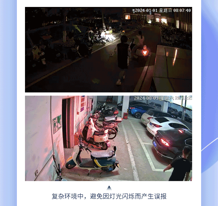 该方案中用于火焰检测的摄像机,内置1t算力,利用特殊火焰识别算法,精准识别火焰状态,确保复杂环境下火焰检测精准度与可靠性;同时摄像机本身具备500万像素及超星光级黑光pro夜视功能,黑夜也能准确识别烟火,保证全天精准监控,提前预警。